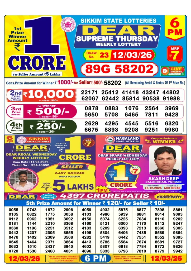 This is a second important result, which is held at 4:00 pm daily and named the West Bengal State Lottery. Its first prize value is about 16 lakhs. To win the lottery, buy a ticket and get the chance to win rewards from highest to lowest. The ticket price is cheap but the winning amount is more. So, try your luck.